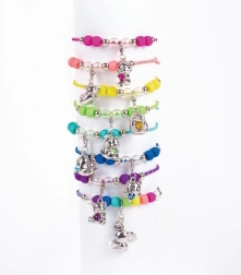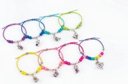 Enthält eine geflochtene Schnur in der Farbe der Figur und 11 bunte Perlen. Einfaches Auffädeln, bequemer Tragekomfort und größenverstellbar für Kinderhandgelenke.