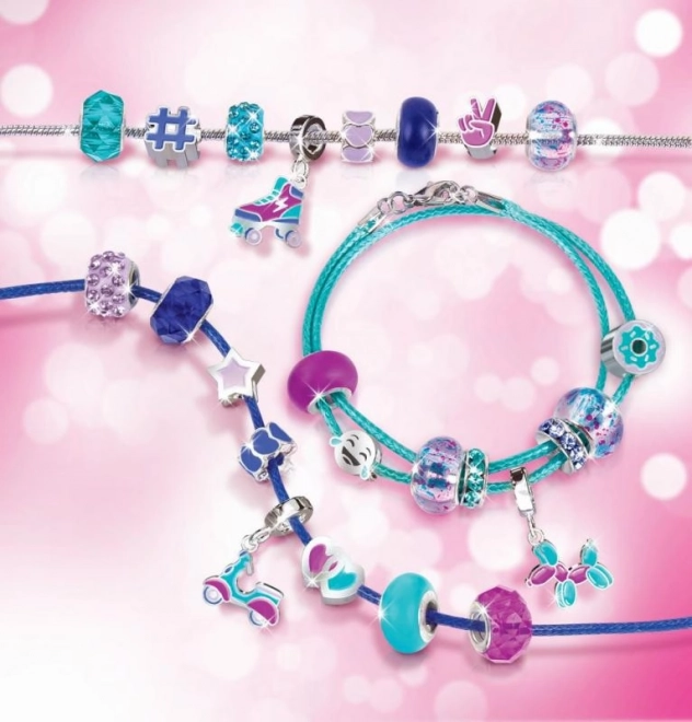 Ein Mix aus silbernen, blauen und violetten Perlen wird durch verspielte Anhänger ergänzt, mit denen Sie ein einzigartiges Schmuckstück nach Maß gestalten.