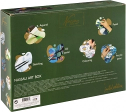 - 2 Graphitstifte, 1 Spitzer, 1 Radiergummi, 24 Buntstifte, 24 Wachsmalstifte, 24 Aquarellfarben, 10 Acrylfarben, 15 Trockenkreiden, 2 Pinsel