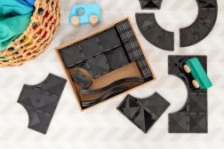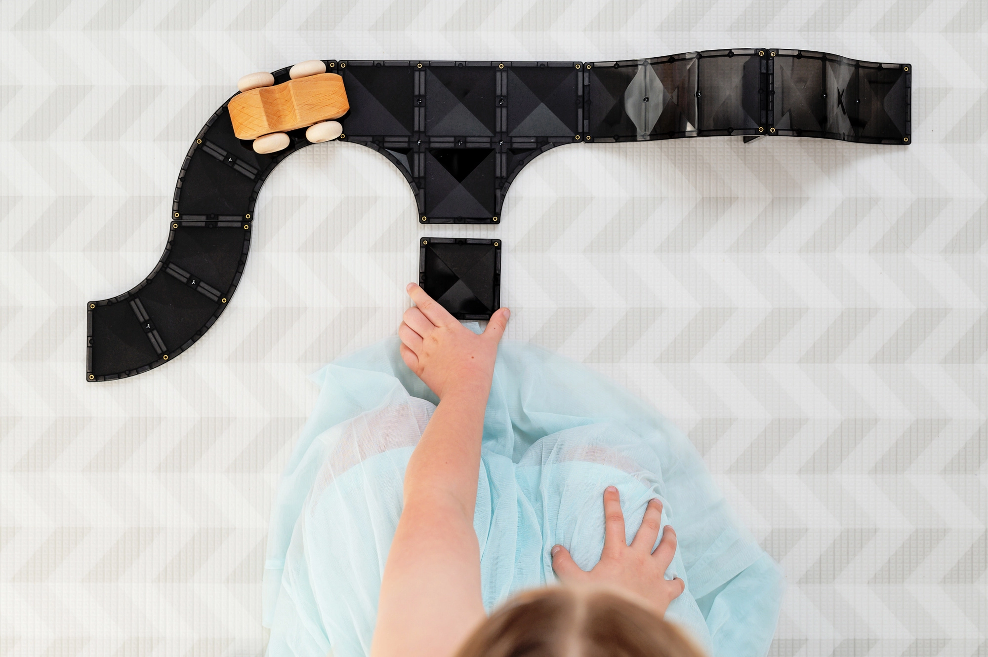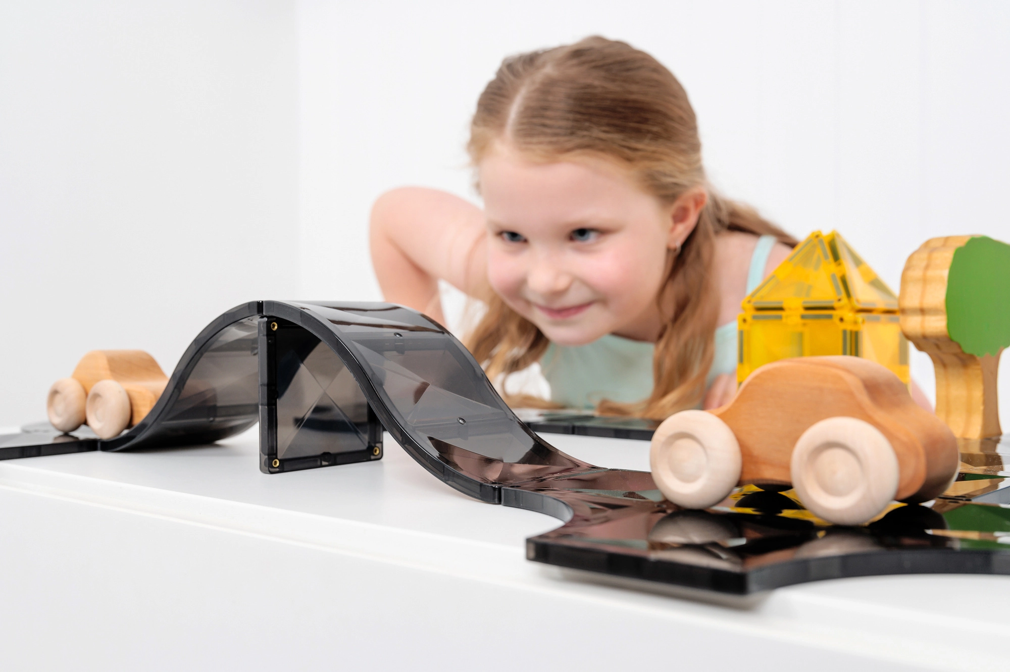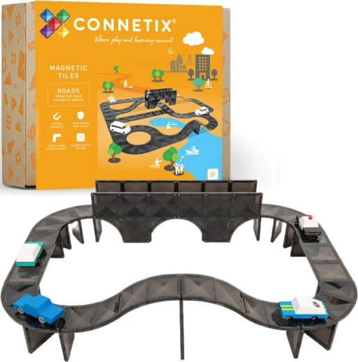 Das Connetix Roads Creative Pack bietet transparente, robuste Straßenteile in elegantem Dunkelton, die dank starker Neodym-Magnete nahtlos zusammenpassen. Kinder bauen Rampen, Kurven, Kreuzungen und Brücken und können darauf mit Holzautos fahren. Beim Spielen trainieren sie ganz natürlich logisches Denken, Motorik sowie Grundlagen der Physik und Geometrie.