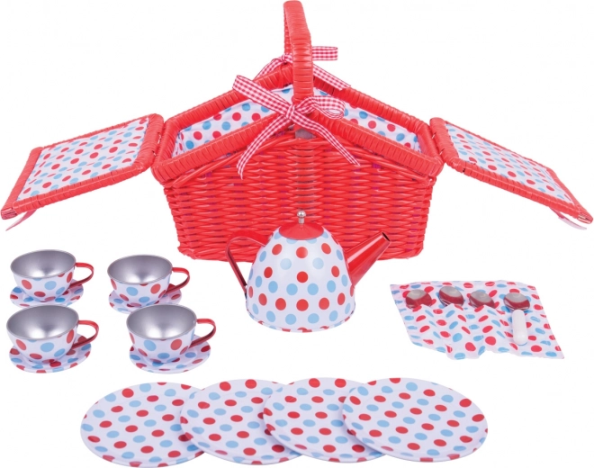 Dieses wunderschöne Teeset ist ideal für Kinder ab 3 Jahren. Es enthält alles Notwendige, um eine Teeparty zu simulieren, und das alles in einem tragbaren roten Weidenkorb.