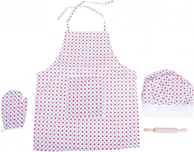 Die angenehme Schürze mit bunten Punkten schützt die Kleidung beim Spielen und beim echten Backen. Die verstellbare Mütze mit Klettverschluss passt sich dem Kopfumfang leicht an und sitzt den ganzen Tag bequem.