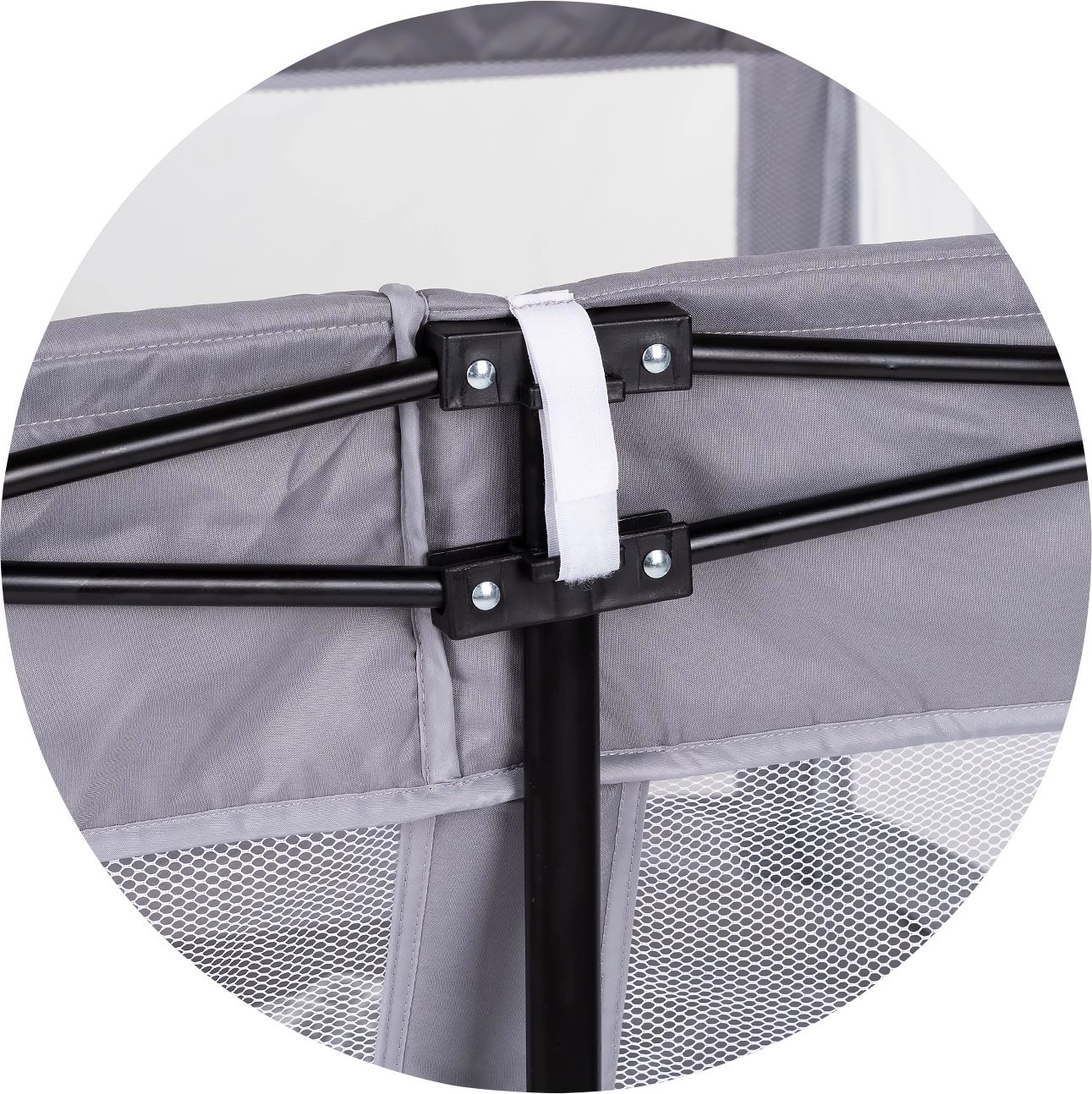Die Montage ist schnell und intuitiv, die Pflege unkompliziert und dank praktischem Zubehör ist der Laufstall für den täglichen Einsatz gerüstet. Halteringe unterstützen die Entwicklung der Grobmotorik und das sichere Üben des Stehens. Das Produkt erfüllt die strenge Norm EN 12227:2010, sodass Sie sich auf die Sicherheit verlassen können.