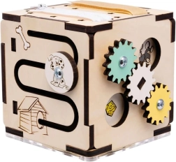 An den einzelnen Seiten finden Sie drehende Zahnräder, Schiebebahnen, einen Reißverschluss, Gummibänder, Türchen mit Riegel sowie ein Fenster mit Perlen für sensorisches Entdecken und das Lernen von Ursache und Wirkung.