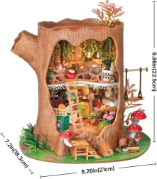 Tauchen Sie in eine Fantasiewelt ein und erschaffen Sie Ihr eigenes Waldhäuschen aus einem Baumstumpf – ein zweistöckiges Minihaus mit Holzmöbeln, Küche, Schlafzimmer, Dekorationen, einem Pilzgärtchen und einer Schaukel im Freien. Mit eingeschalteten LED-Lichtern wird das Modell zu einer bezaubernden Ausstellung und zum Blickfang in jedem Regal.