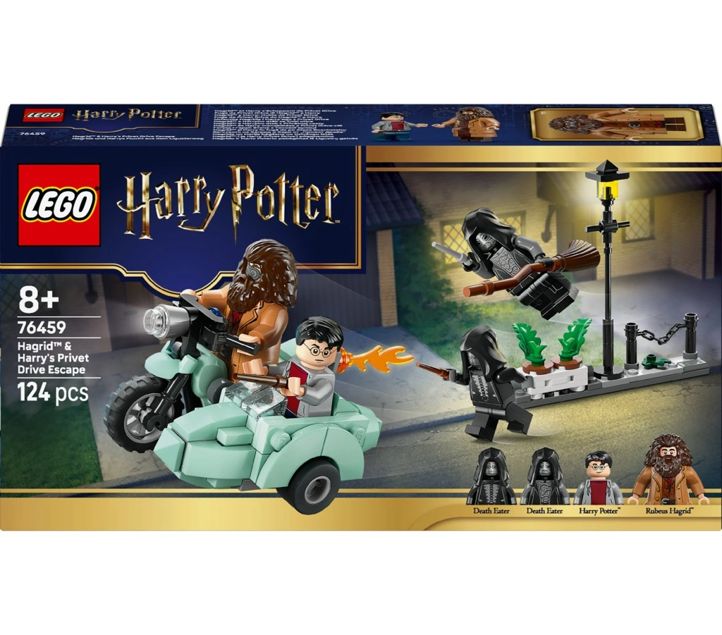 Dieses Set fängt die dramatische Flucht vor den Todessern originalgetreu ein: Hagrid hält den Lenker seines hellgrünen Motorrads, während Harry sicher im geräumigen Beiwagen sitzt. Für den authentischen Look sorgen ein transparentes Frontlicht, robuste Reifen und die düster gestaltete Miniszene der Ligusterallee mit Laterne, Zaun und umstürzbarem Blumentopf.