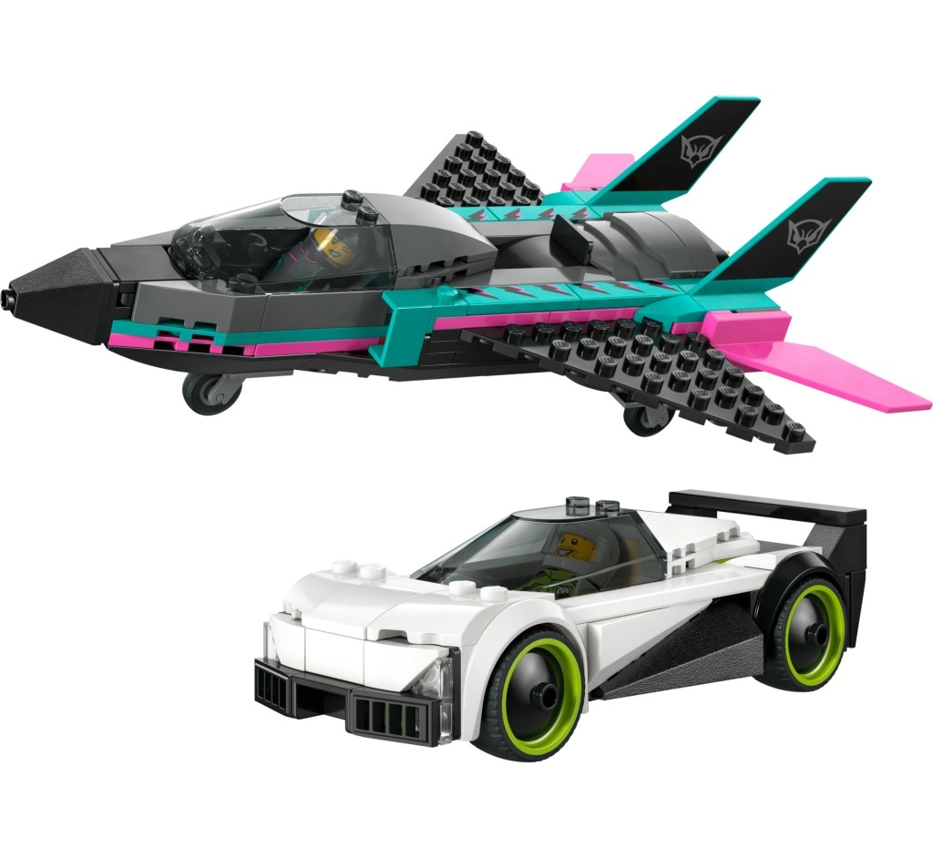 Dieses dynamische Set vereint Tempo und Kreativität: ein eleganter weißer Rennwagen mit neongrünen Felgen und ein aerodynamischer Jet in schwarz-türkis-rosa Farbgebung. Aufklappbare Cockpits ermöglichen das einfache Platzieren der Minifiguren und bereiten die Bühne für spannende Rennen und Luftshows.