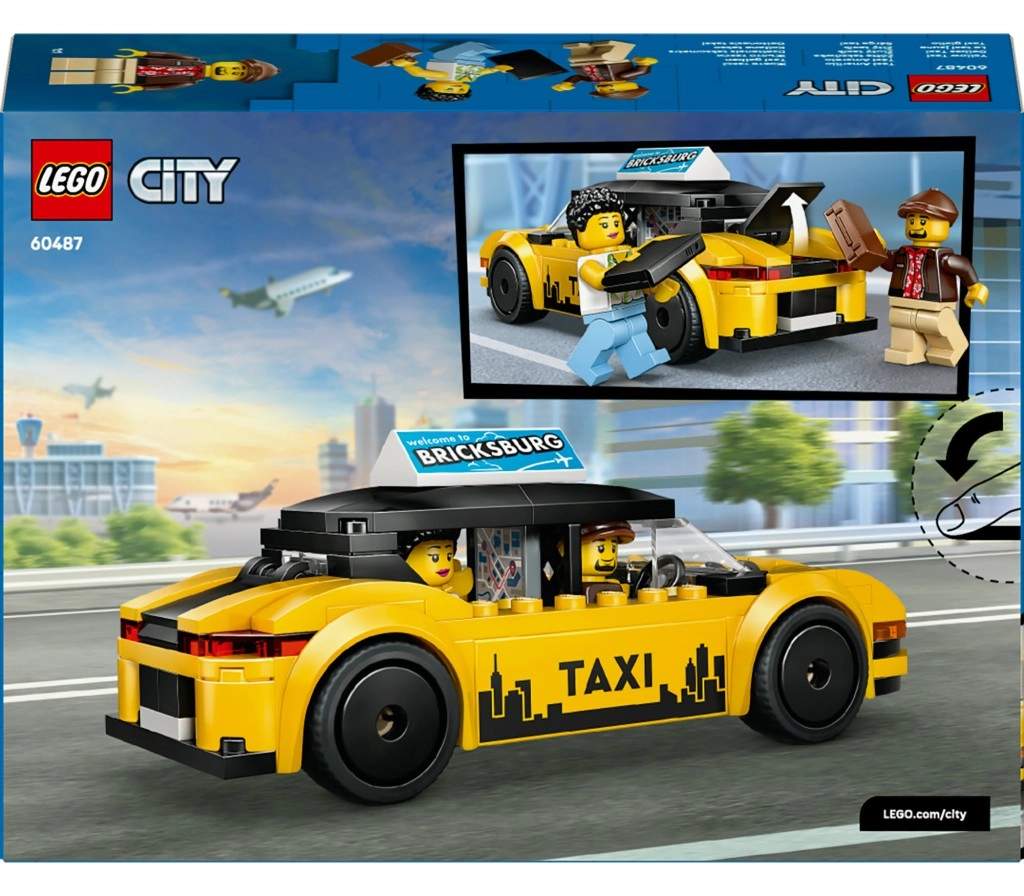 Gelbe Farbgebung mit schwarzen Streifen, der Aufschrift TAXI und einem Werbepanel „Welcome to Bricksburg“ verleihen dem Modell in jeder LEGO City Szene einen realistischen Look.