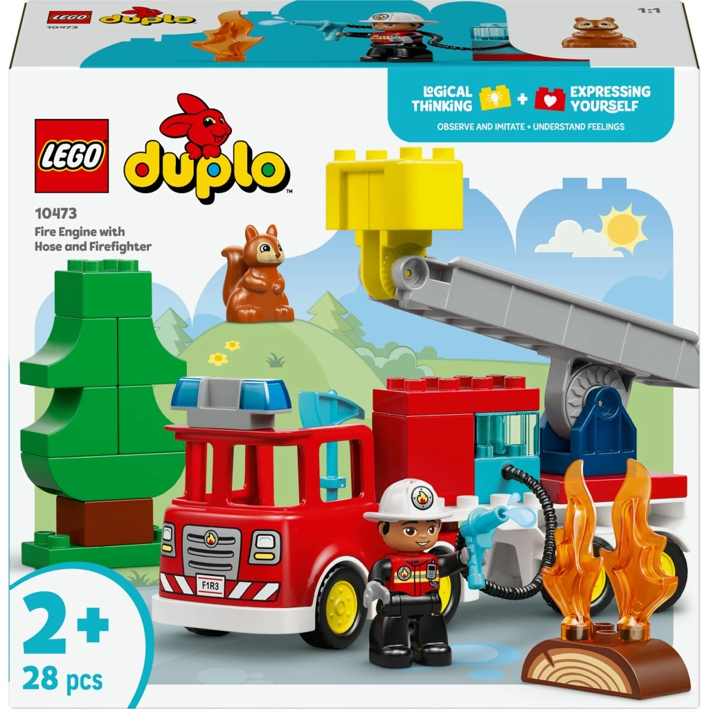 Entdecken Sie das unterhaltsame LEGO DUPLO Feuerwehrauto mit Schlauch und Feuerwehrmann für die Kleinsten. Das Set für Kinder ab 2 Jahren enthält ein rotes Feuerwehrauto mit klappbarer Leiter und flexiblem Schlauch, eine Feuerwehrmann-Figur und ein niedliches Eichhörnchen. Ideal zur Förderung von Feinmotorik, Vorstellungskraft und kreativem Rollenspiel.