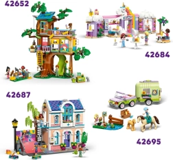 Enthalten sind die Minifiguren Liann, Aliya und die Trainerin Cindy, die Pferde Coco und Thunder sowie zwei Katzen und ein kleiner Hund. Zubehör wie ein Heuschubkarren, Futterkisten, Hindernisse, Trophäen und eine Lektionstafel unterstützen freies, kreatives Spielen.