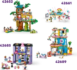 Der LEGO Friends lustige Indoor-Spielplatz ist für verspielte Kinder gestaltet, die entdecken, erschaffen und eigene Geschichten bauen möchten. Drei verbundene Bereiche mit Attraktionen bringen vielfältige Herausforderungen – vom orangen Kletternetz über die blaue Rutsche ins bunte Bällebad bis hin zum Trampolin, Karussell und einem niedlichen Hüpfhäschen. Realistische Zubehörteile wie ein Imbiss mit Hotdogs und Slush-Eis, ein Tanzautomat, ein Kaugummiautomat und eine Kasse fehlen ebenfalls nicht.