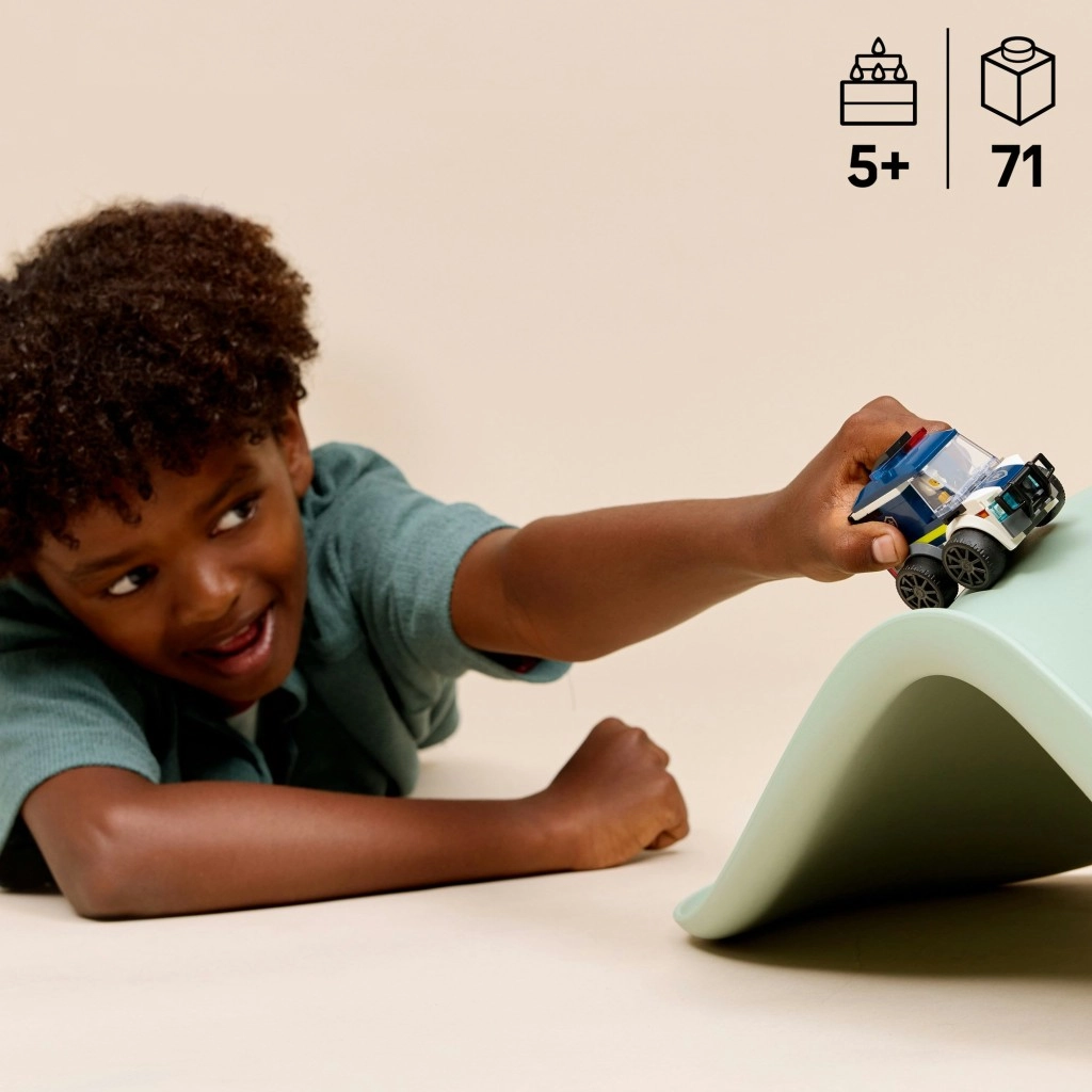Enthalten ist eine Polizist-Minifigur in dunkelblauer Uniform mit Helm, die in die offene Kabine mit klarem Frontfenster passt. Dank der Kompatibilität mit der LEGO Builder App können Kinder das Modell leicht in 3D anzeigen, heranzoomen und drehen – das erleichtert den Bau und steigert den Spielspaß.