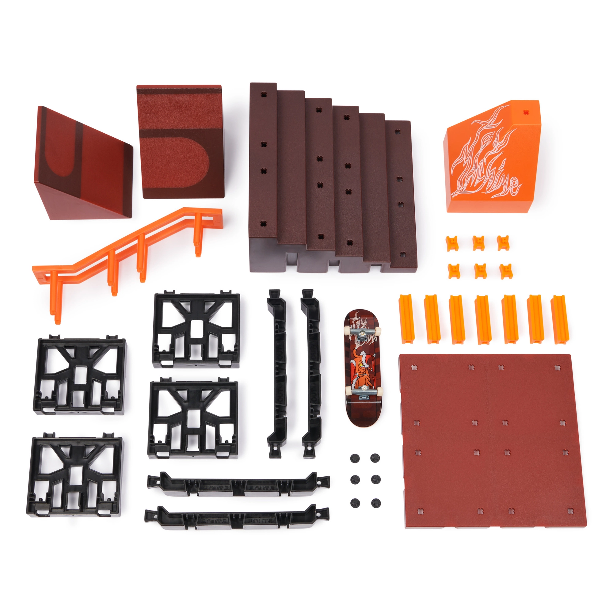 TECH DECK Fingerboard, kleine Pyramide, Stange (Rail), 2× Wedge-Rampe, quadratisches Panel, Treppenset, 4× kleine Stütze, 4× Träger, 6× kleiner X-Connect-Connector, 7× großer X-Connect-Connector, 6× Montagestütze, Anleitung