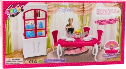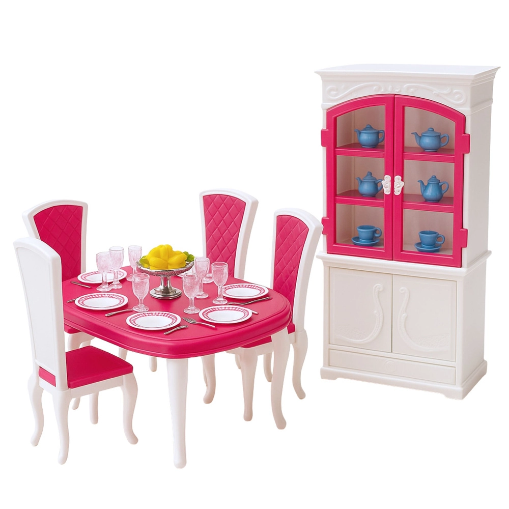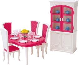 Elegantes Möbel- und Zubehörset für Puppen ca. 29 cm, das jedes Puppenhaus in ein realistisches Esszimmer verwandelt. Enthält Tisch, Stühle, eine Anrichte mit öffnenden Türen und umfangreiche Tischausstattung. Robuste Ausführung aus Kunststoff, rosa‑weiße Farbgebung und klassischer Stil fördern kreatives Spiel, die Entwicklung sozialer Kompetenzen und Rollenspiele. Entspricht den Normen CE und EN71.