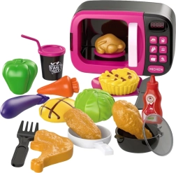 Über das Touchpanel mit Tasten können kleine Köchinnen und Köche ein „Programm wählen“ oder die Erwärmungszeit einstellen. Das umfangreiche Set aus Kunststofflebensmitteln und Zubehör fördert Feinmotorik, Fantasie und soziale Fähigkeiten beim gemeinsamen Spielen.