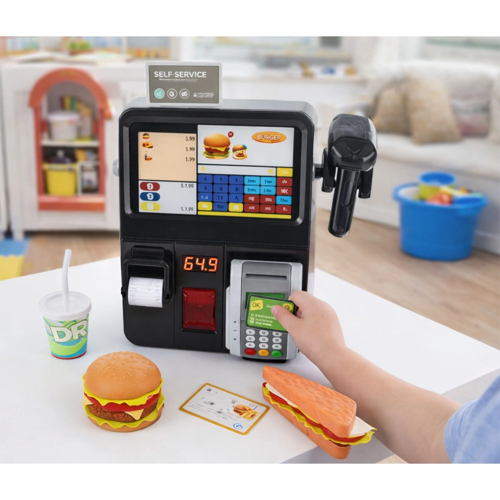 Diese Selbstbedienungs-Kinderkasse ist ideal für kleine Verkäuferinnen, Verkäufer und Köchinnen, Köche. Realistische Funktionen – vom Scannen über den Quittungsdruck bis zur Kartenzahlung – schaffen eine authentische Atmosphäre wie im Laden oder Fast-Food-Restaurant. Dank Licht- und Soundeffekten ist das Spiel dynamisch und fesselnd.