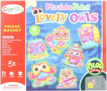 Einfach den Gips anrühren, in die Kunststoffform mit 6 verschiedenen Motiven gießen, aushärten lassen und anschließend mit den beiliegenden Acrylfarben bemalen. Auf die Rückseite wird ein Magnet geklebt – fertig ist eure leuchtende Deko für den Kühlschrank!
