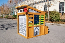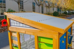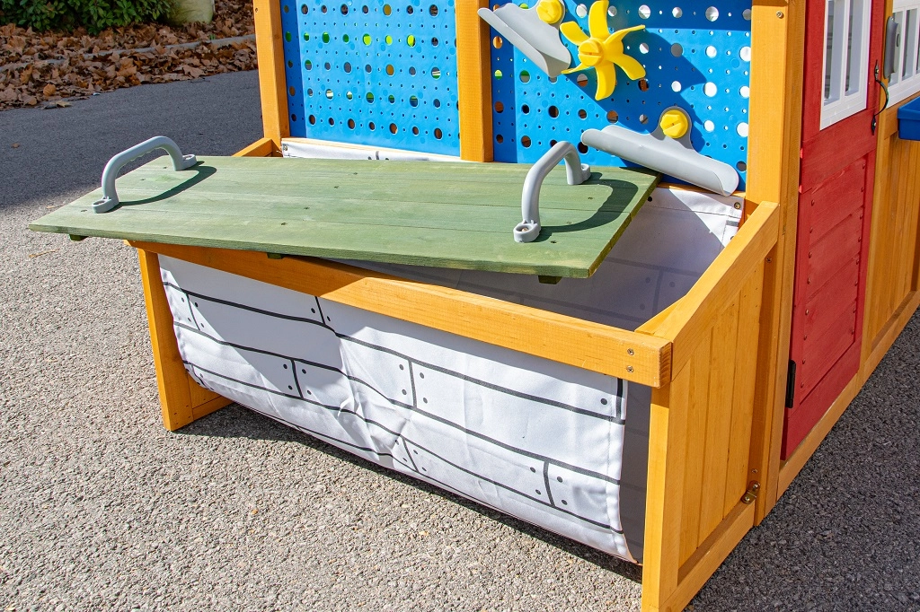 Das rollbare „Garagen“-Tor mit Griff, die robuste Bank mit 100 kg Tragkraft und Details wie Vogelhäuschen und Fensterkasten verbinden das Spiel mit der umgebenden Natur.