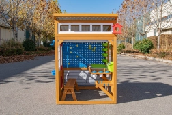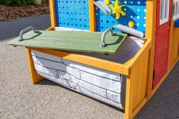 Das Gartenhaus Hobby Workshop verwandelt Ihren Garten in einen sicheren und anregenden Spielplatz. Die robuste Holzkonstruktion mit Satteldach erinnert an eine kleine Werkstatt und lädt zu fantasievollem Spiel ein. Kinder genießen das Öffnen und Schließen des Rolltors mit Griff, das Experimentieren an der Lochwand sowie die Arbeit am erhöhten Tisch mit praktischer Arbeitsplatte.