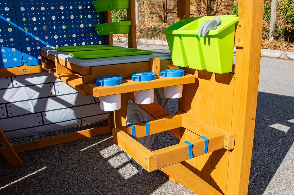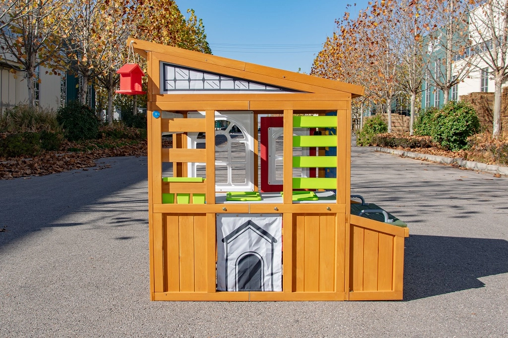 Clevere Aufbewahrungslösungen – Fächer, Becher, Kästen und die Außenbank – helfen, Ordnung zu halten und stärken zugleich die Selbstständigkeit. Das Häuschen verfügt außerdem über eine klassische Tür und einen kleinen Eingang für Haustiere, sodass die ganze Familie leicht ins Spiel einbezogen werden kann. Modernes Design, hochwertige Verarbeitung und widerstandsfähige Materialien garantieren eine lange Lebensdauer bei ganzjähriger Nutzung im Freien.