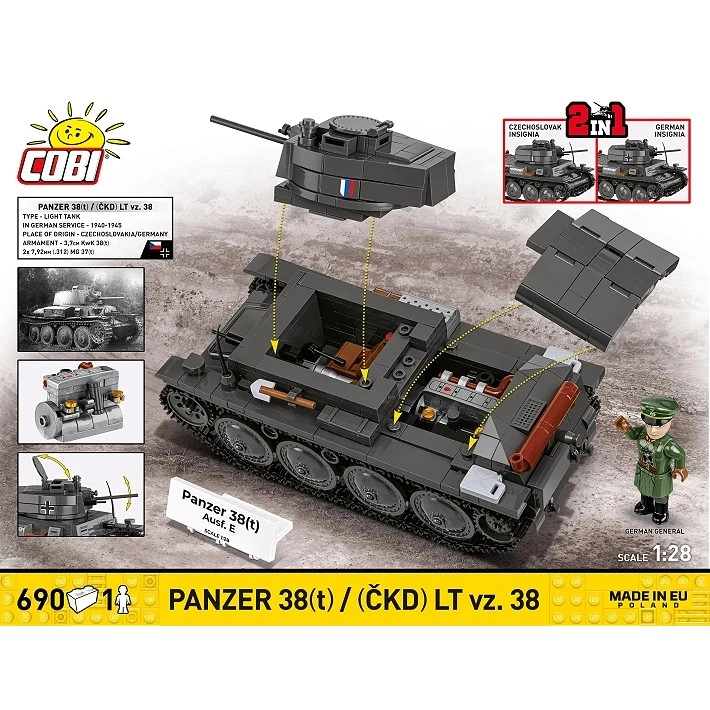 Eine Packung, zwei historische Versionen. Bauen Sie den tschechoslowakischen LT vz. 38 oder den deutschen Panzer 38(t) und bauen Sie jederzeit nach Wunsch um.