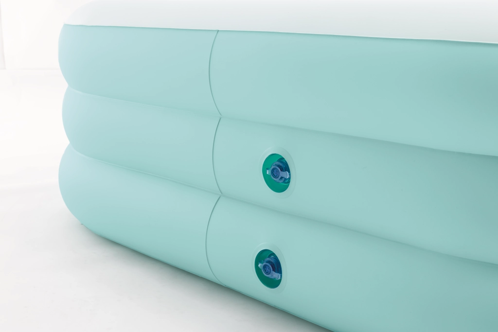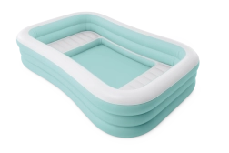 Der aufblasbare Pool Swim Center Family Lounge ist ideal für die Familienerholung im Garten oder auf der Terrasse. Die rechteckige Form mit leicht abgerundeten Ecken und die Kombination aus Hellblau und Weiß wirken frisch und elegant. Drei separate Luftkammern sorgen für Festigkeit, Stabilität und eine komfortable Wandhöhe, sodass Kinder ab 6 Jahren ebenso wie Erwachsene das Baden genießen können.