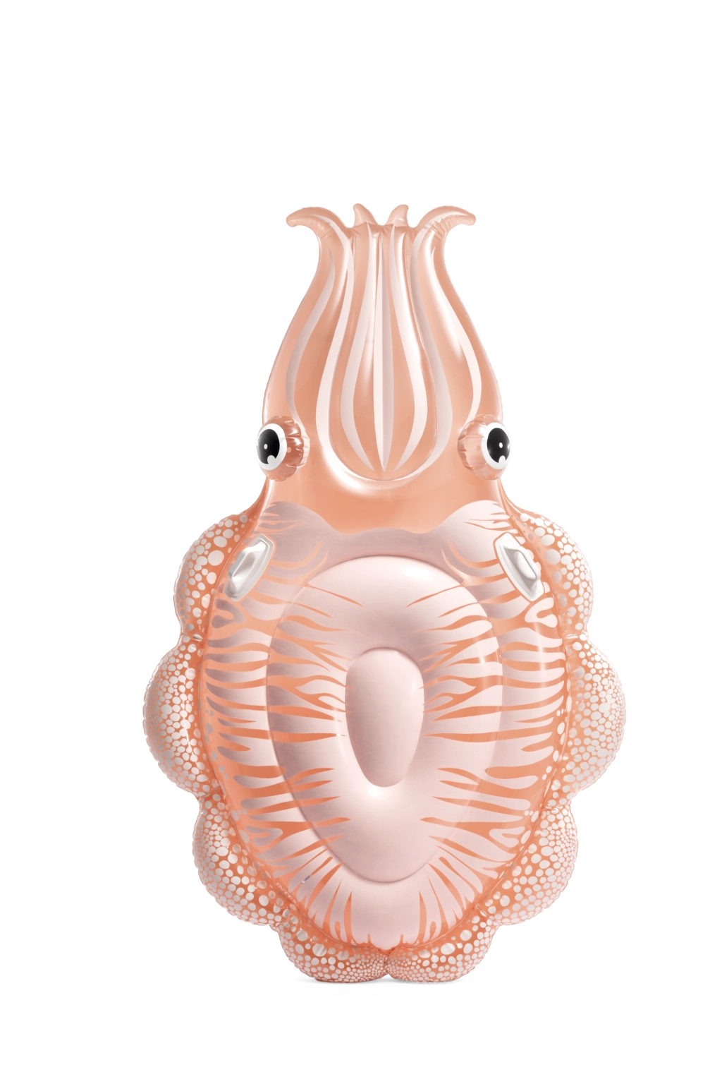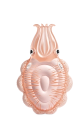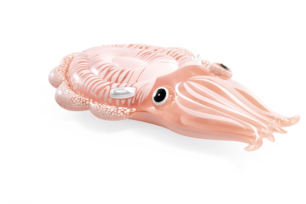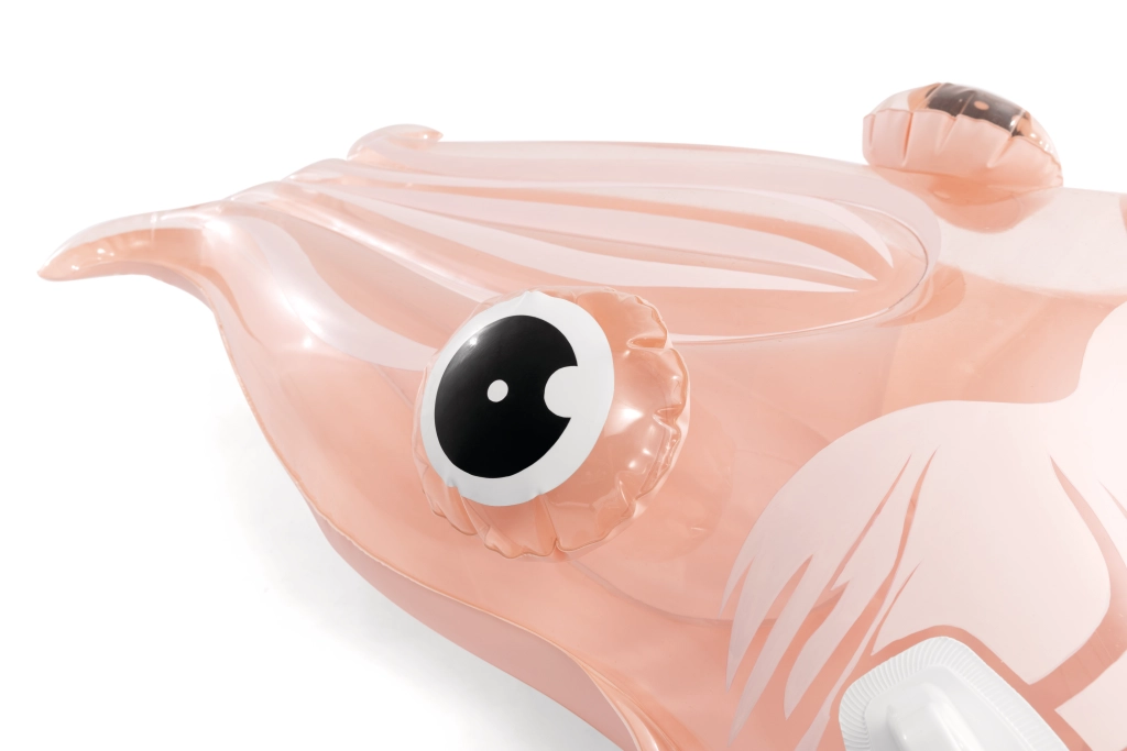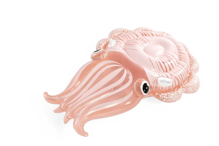 Die aufblasbare Liege in Oktopus-Form verbindet ein originelles Erscheinungsbild mit praktischen Funktionen für sicheren Wasserspaß. Das transparente PVC mit rosa–orangem Schimmer und den markanten Details des Oktopuskörpers wirkt sehr ansprechend und passt perfekt zur sommerlichen Atmosphäre am Pool oder an ruhigen Naturgewässern.