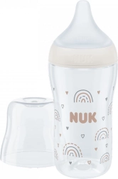 Der integrierte NUK Temperatur-Kontrollanzeiger wechselt die Farbe von Blau (kalt) zu Weiß (zu heiß), um dabei zu helfen, zu heiße Nahrung zu vermeiden. Ideal ist eine Temperatur um 37 °C, wenn der Anzeiger blau ist. Die Flasche besteht aus robustem, hygienischem Glas, ist BPA-frei und erfüllt die europäische Norm EN 14350.