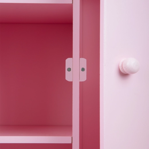 Dieser hochwertige Puppenschrank aus Holz in zartem Rosa ist ideal für die aufgeräumte Aufbewahrung der Kleidung und Accessoires Ihrer Puppen. Der linke Bereich bietet zwei praktische Regalböden, die rechte Seite ist mit einer Kleiderstange für Kleidchen ausgestattet. Die Türen mit Magnetverschluss lassen sich leicht bedienen und die Stern- und Mondausschnitte verleihen dem Möbelstück eine zauberhafte Optik.