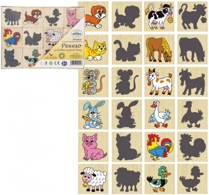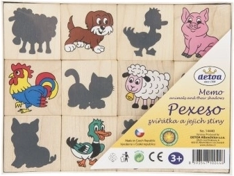 Pexeso aus Holzplättchen mit Aufdruck von Tieren und ihren Schatten. Hilft auf unterhaltsame Weise, die Vorstellungskraft und das Gedächtnis Ihrer Kinder zu entwickeln.
