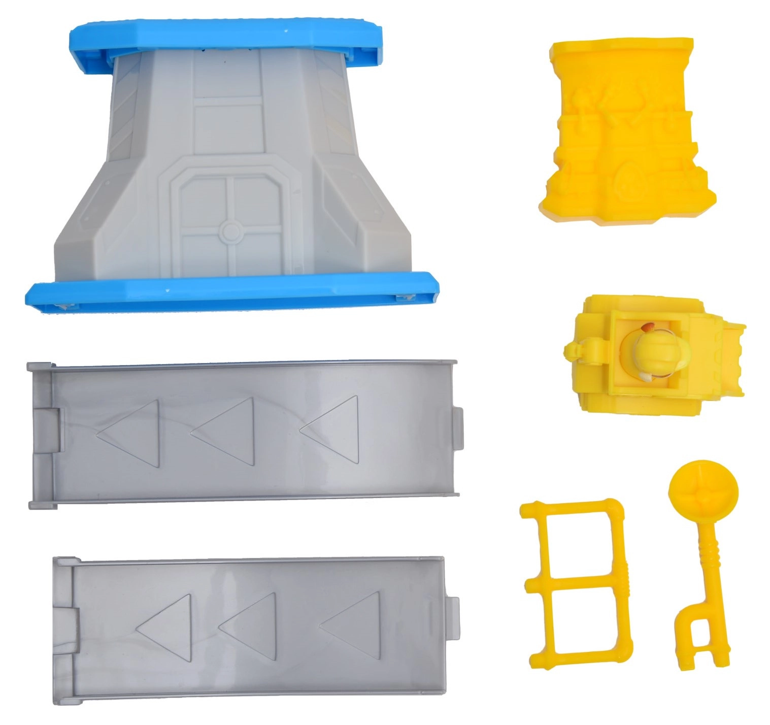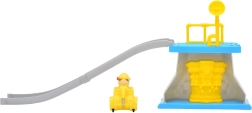 Die gebogene graue Rampe mit blauer Plattform und gelbem Geländer sorgt für eine sanfte Abfahrt des Fahrzeugs und jede Menge dynamischen Spielspaß.