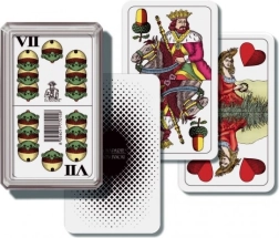 Klassisches Kartenspiel Mariáš mit Doppelkopf-Karten, ideal für gesellige Treffen und Unterhaltung. Das Spiel wird in einer praktischen Kunststoffbox für einfaches Tragen geliefert.