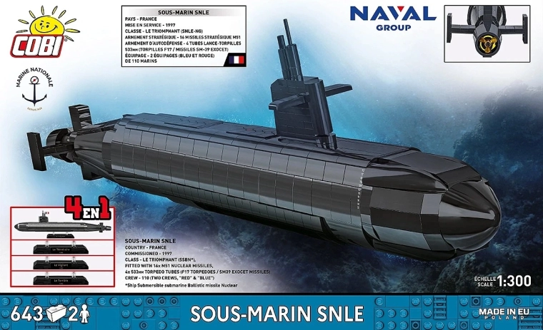 Dieser Sammler-Bausatz führt Sie in die stille Welt unter der Wasseroberfläche, wo SNLE-U-Boote seit 1972 die kontinuierliche nukleare Abschreckung Frankreichs sicherstellen. Das Modell im Maßstab 1:300 besteht aus 643 Teilen und ergibt nach dem Aufbau ein beeindruckendes Ausstellungsstück mit Namensschild und französischer Flagge.
