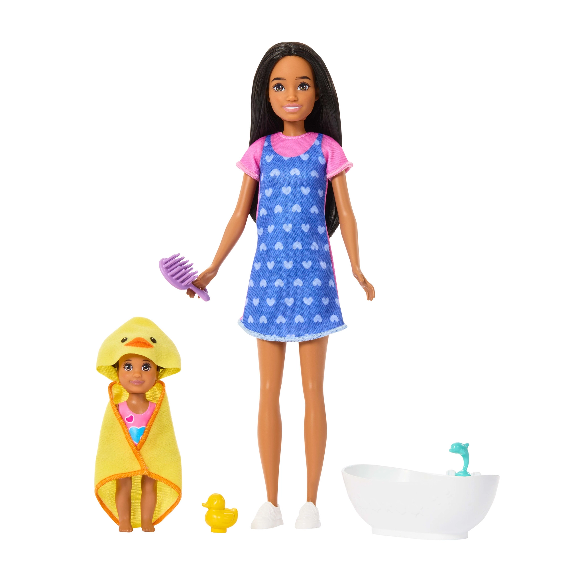 Badewännchen, Entchen, Kapuzenhandtuch und weiteres Zubehör ermöglichen Kindern, echte Badeszenen mit dem Baby und Skipper nachzuspielen.