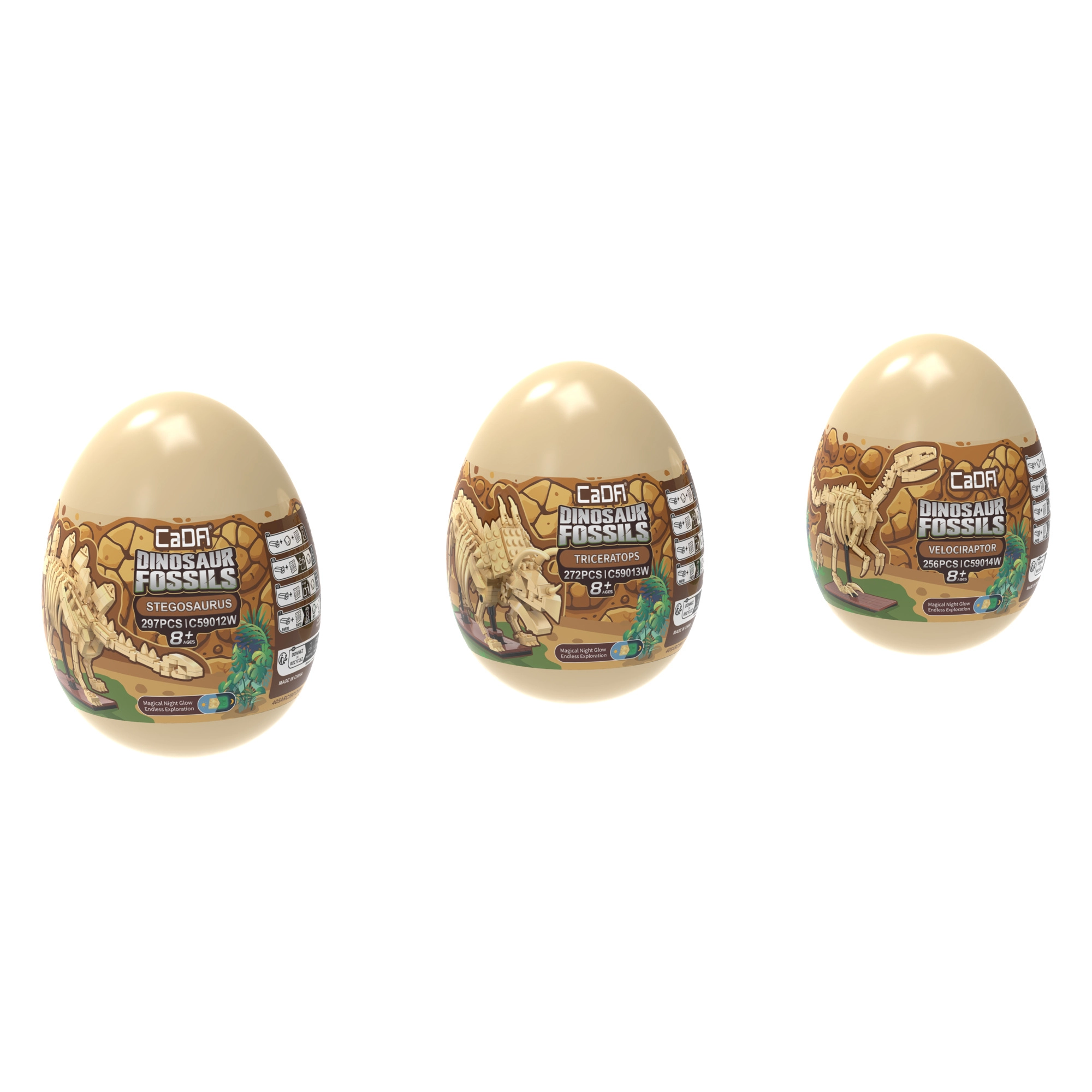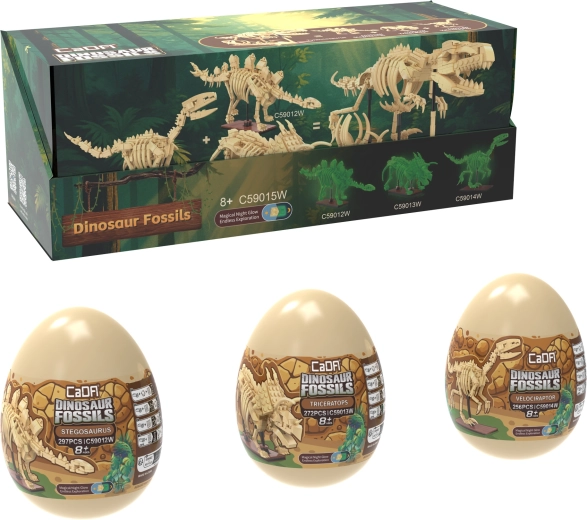 Das Bausteinset CaDA Dinosaur Fossils begeistert kleine und große Fans der Urzeit und lehrreicher Modelle. Aus hochwertigen Teilen entstehen drei beeindruckende Skelett-Exponate mit gelenkig beweglichen Gliedmaßen, Schwanz und Kiefer, die Sie in verschiedene Posen arrangieren können. Das spezielle Material der Knochen leuchtet im Dunkeln, sodass die Modelle auch nach Einbruch der Dunkelheit zu einer originellen Dekoration werden.