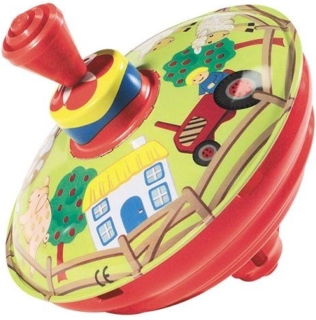 Dieser traditionelle Spielkreisel mit Bauernhofmotiv ist das ideale Spielzeug für die Kleinsten. Der einfache Hebelmechanismus setzt den Kreisel in Rotation, die für charakteristische Geräusche und visuelle Reize sorgt.