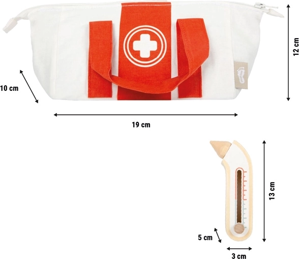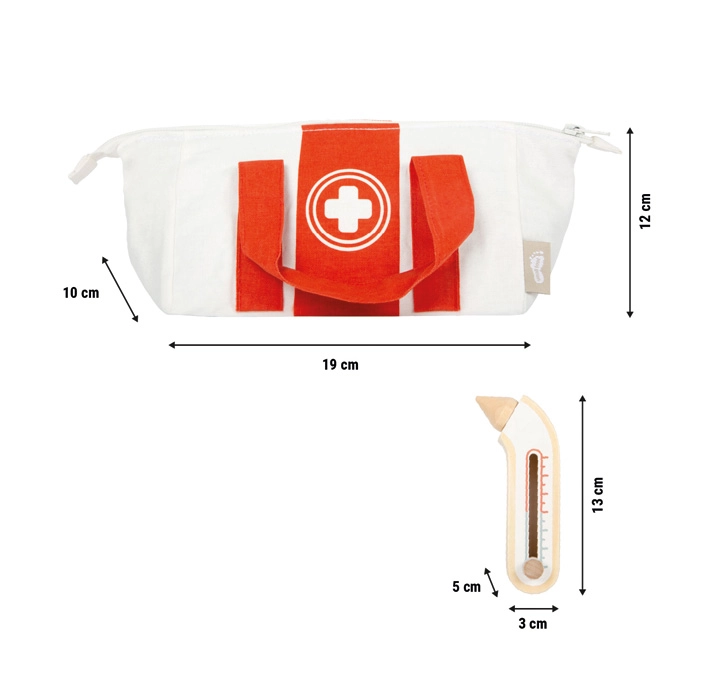 Realistische Funktionen wie die einschiebbare Spritze und das verstellbare Thermometer fördern die Koordination und unterstützen das natürliche Lernen über Körper und Gesundheit. Die hochwertige Holz- und Textilverarbeitung sorgt für Langlebigkeit und sicheres Spiel.