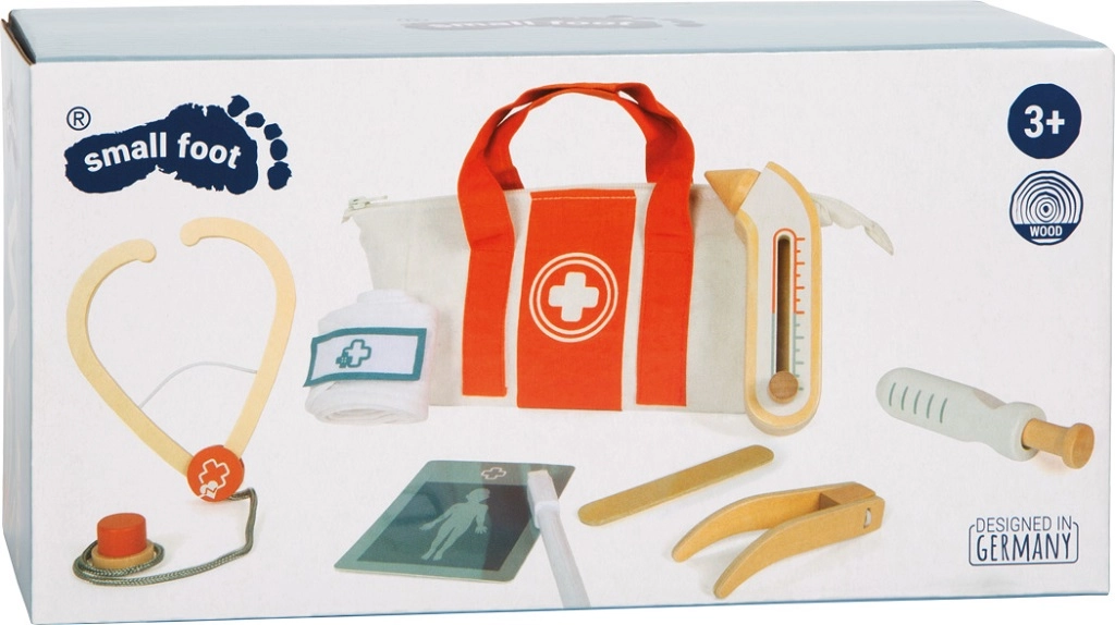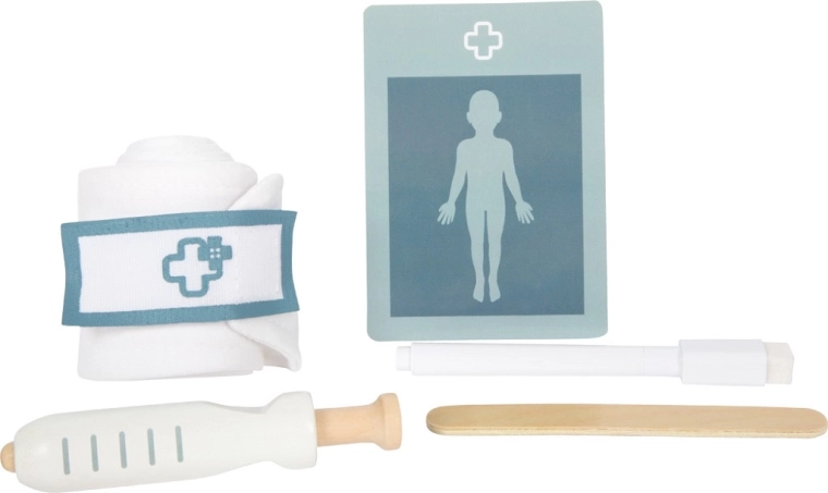 Stethoskop, Thermometer mit Schiebeskala, Spritze, Pinzette und Spatel – sicher, glatt und angenehm für Kinderhände, fördern die Feinmotorik.