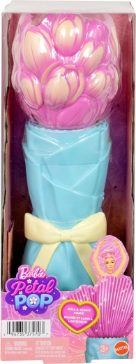 Barbie ist im Stil einer rosa Tulpe gestaltet – verziertes Oberteil und ein Lagenröckchen wie Blütenblätter. Das Set enthält Überraschungen in Tütchen mit Accessoires wie Häschenfigur, Halskette und Ohrringen, die Fantasie und kreative Geschichten anregen.