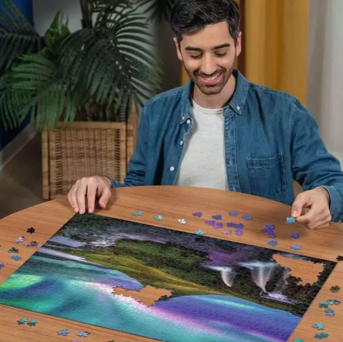 Das Motiv „Magische Nacht in Island“ zeigt Polarlichter, Wasserfälle und einen Fluss in atemberaubenden Farben. Das Puzzle mit 1000 Teilen ist die ideale Wahl für fortgeschrittene Anfänger wie auch Geübte, die sowohl entspannenden Spaß als auch eine mentale Herausforderung suchen.
