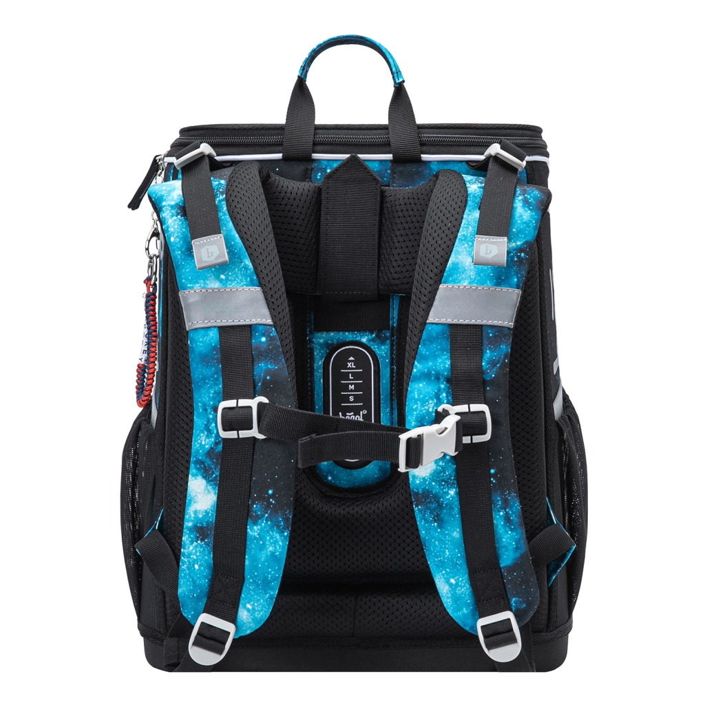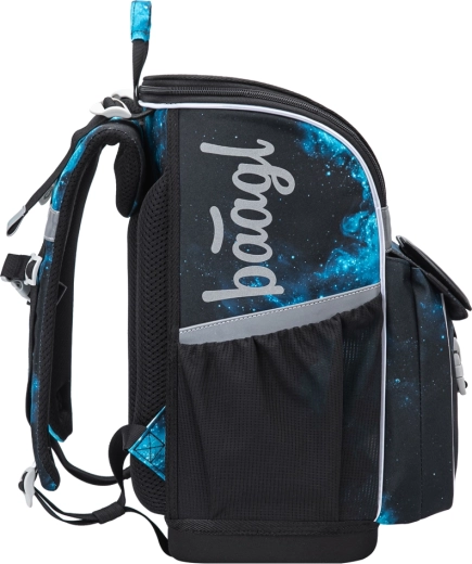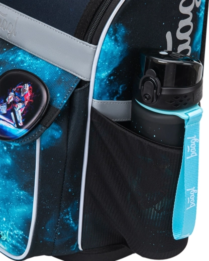 Das aufklappbare Öffnungssystem, das geräumige Hauptfach mit Organizer, ein Gummiband zur Fixierung des Inhalts und Seitenfächer für die Flasche sorgen für Übersicht und Stabilität der Schulutensilien.