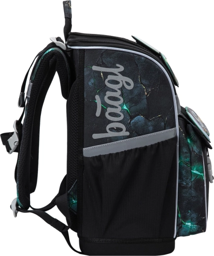Aufklappöffnung für leichten Zugriff direkt vom Tisch, innen ein Gummiband zur Fixierung von Schulbüchern und stabile Seitentaschen für eine Trinkflasche. Reflektierende Elemente erhöhen die Sichtbarkeit.