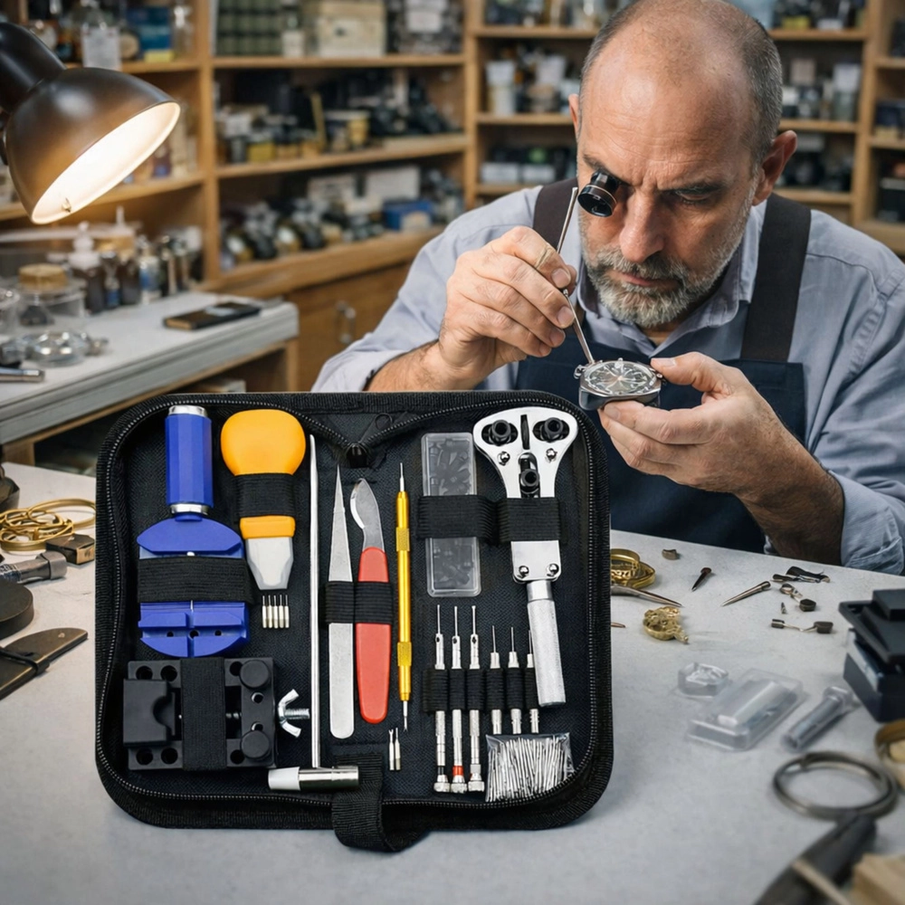 Dieses professionelle Uhrmacher-Set ist für die präzise Handhabung von mechanischen und Quarzuhren konzipiert. Es ermöglicht Ihnen, Routinewartungen und anspruchsvollere Arbeiten selbst durchzuführen – vom Öffnen des Gehäuses über das Kürzen des Armbands bis hin zum Wechseln von Batterie und Federstegen. Ergonomische, rutschfeste Griffe und hochwertige Verarbeitung sorgen für sicheren Halt und schonendes Arbeiten mit empfindlichen Mechanismen.