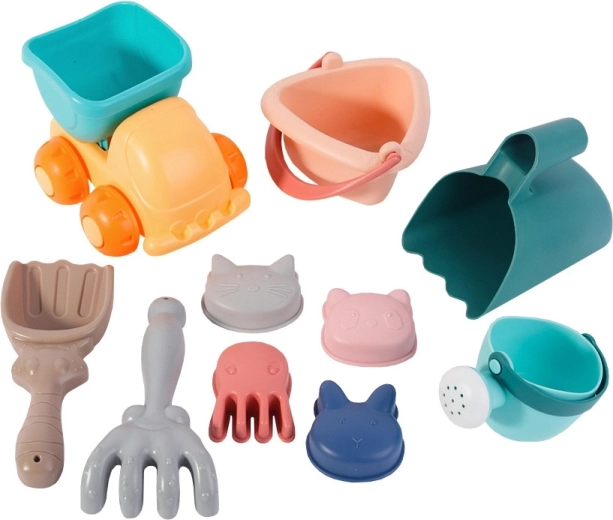 Enthalten ist ein niedlicher Kipper, mit dem Kinder Sand und Förmchen ganz leicht zwischen ihren „Baustellen“ transportieren können.