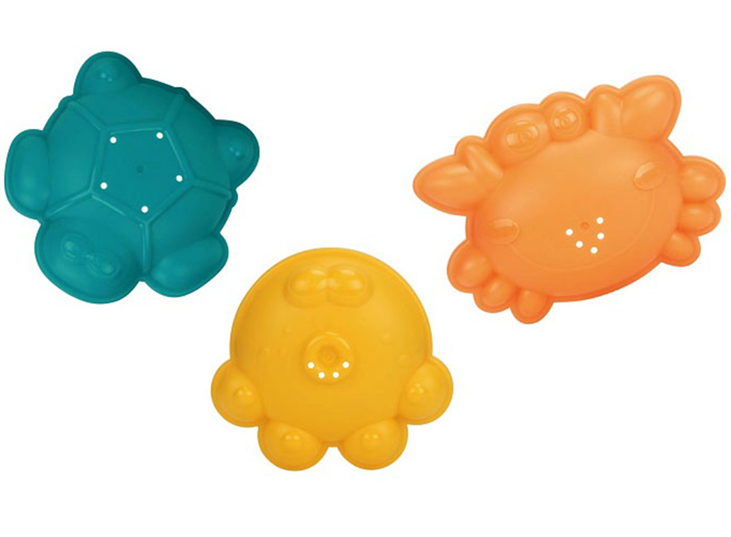 Drei farbige Förmchen regen Fantasie und Kreativität im Sand und im Wasser an. Kinder formen im Nu eine Schildkröte, einen Krebs oder einen Oktopus.