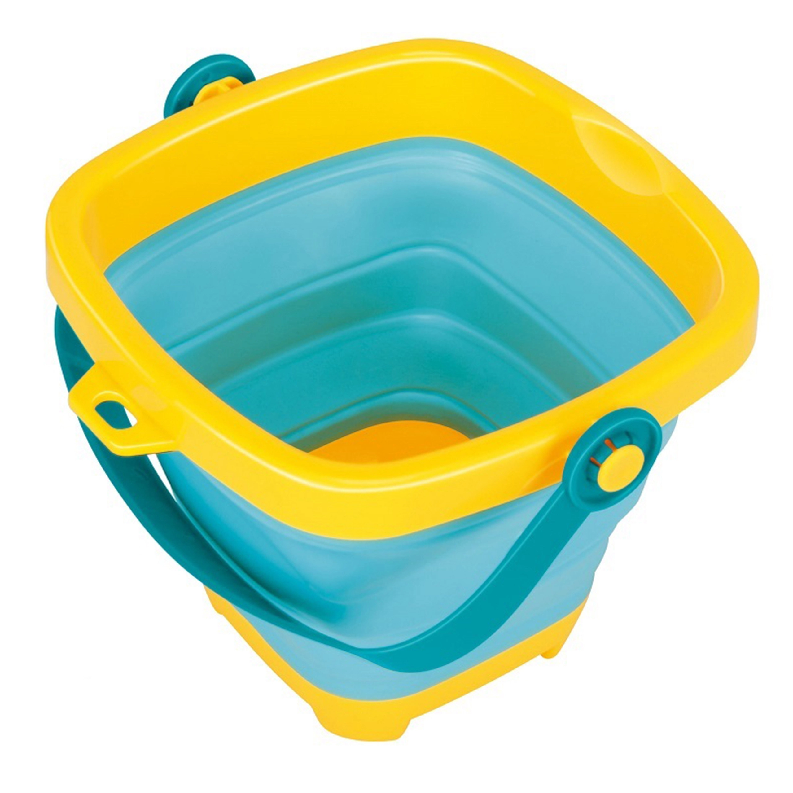 Der Eimer ist 4 cm hoch im zusammengeklappten und 16 cm im ausgeklappten Zustand – ein idealer Begleiter für Ausflüge und Urlaube. Das Set fördert Kreativität, Feinmotorik und das Spielen an der frischen Luft.