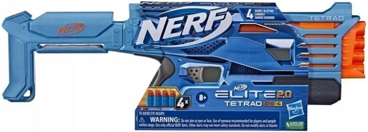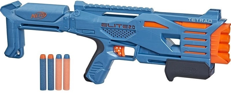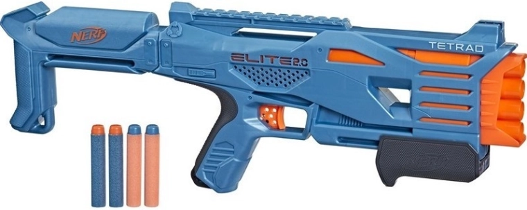 Erleben Sie rasante Action mit der Nerf Elite 2.0 Tetrad QS-4, die schnelles Nachladen, dynamisches Schießen und großen Spaß drinnen wie draußen bietet.