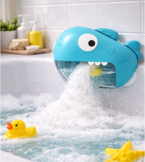 Das interaktive Bade-Spielzeug in Hai-Form verwandelt die Routinewäsche in ein freudiges Ritual. Einfach mit Saugnäpfen auf einer glatten Oberfläche befestigen, Wasser mit etwas Duschgel in den herausnehmbaren Behälter füllen und mit einem einzigen Knopfdruck die Produktion von reichlich Schaum starten, der aus dem Maul des Hais fließt und Kinder während des gesamten Bades begeistert.