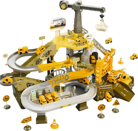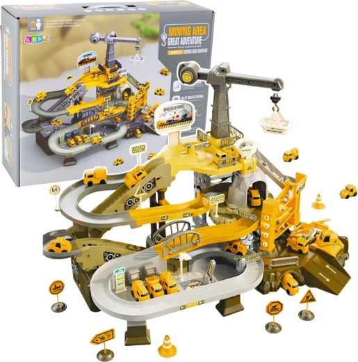 Der interaktive Grubenparkplatz ist ein umfangreich ausgestattetes Spielzeug für kleine Baumeister. Dank der automatischen elektrischen Rampe gelangen Fahrzeuge mühelos in höhere Ebenen, während der drehbare Kran Lasten und Kugeln bewegt, die abgebautes Material imitieren. Die mehrstöckige Strecke mit Kurven, Abfahrten und Tunneln bietet dynamisches Spiel und realistische Szenarien aus Bergwerk und Baustelle.