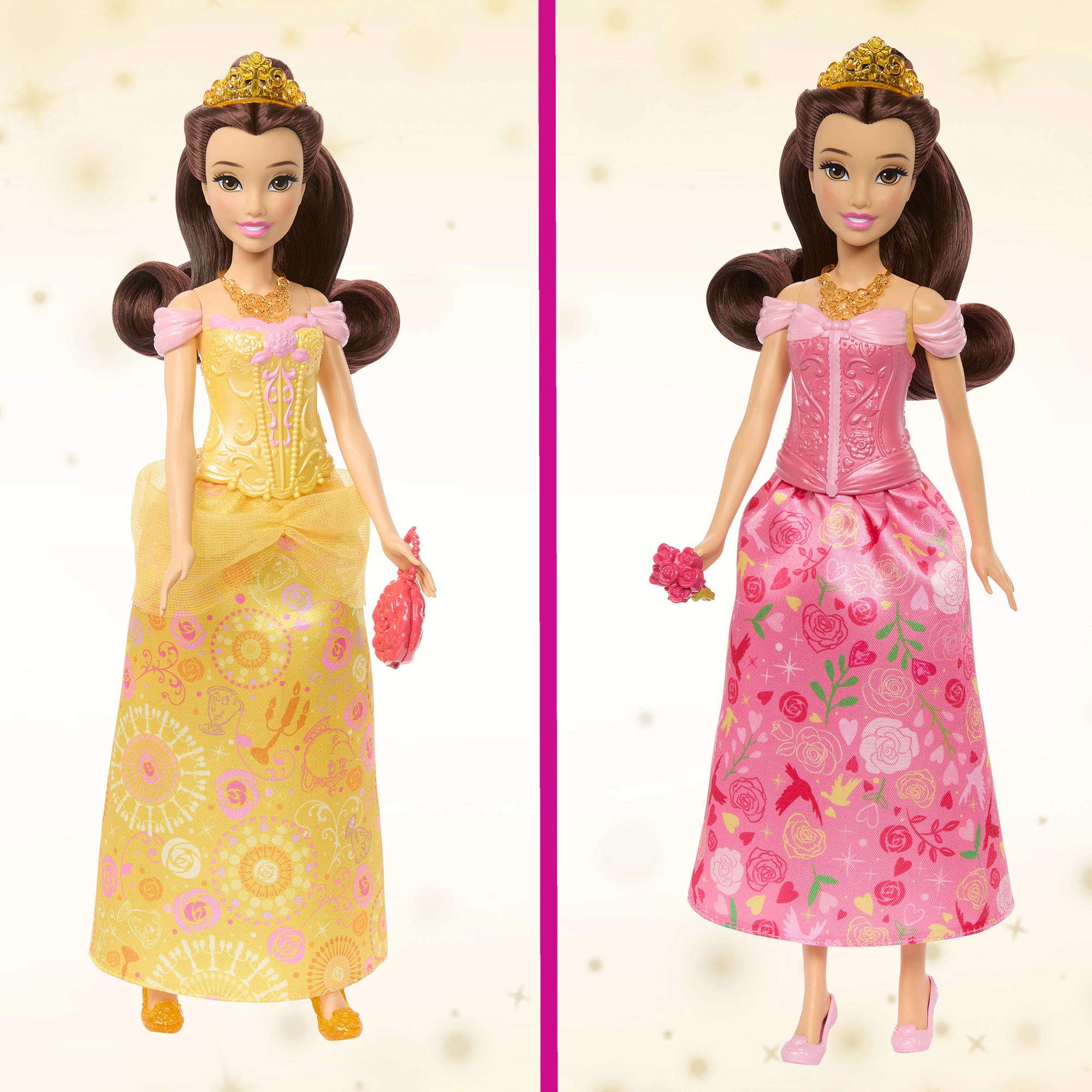Die Puppe ermöglicht einen einfachen Look-Wechsel – einfach Korsett und Rock tauschen und aus einem Nachmittagstreffen wird im Handumdrehen ein zauberhafter Ball. Das lange Haar kann gekämmt und mit der Tiara geschmückt werden, Accessoires fördern Rollenspiele und dank der Gelenkpunkte posiert Belle wunderschön bei jedem Abenteuer.